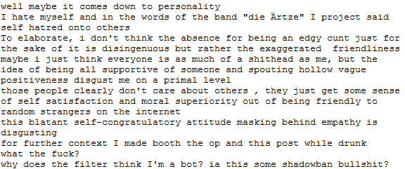 A lot of us have been in the chanosphere for a while and were around for things like Krautchan /int/ circa 2009-2010 that were just soaked to the bone and beyond with hate. It was like a troll shooting gallery, a shooting trollery if you will. That's fun and all but it choked out any earnest discussion and the negativity could actually fuck your state of mind up.