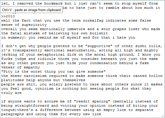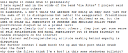 if you have a lot of personal angst then i hope you find a way to get it out of your system but ideally it should not involve disrupting other people's mood or the carefully maintained spaces in which they feel able to express themselves. shitposting venues are a dime a dozen.