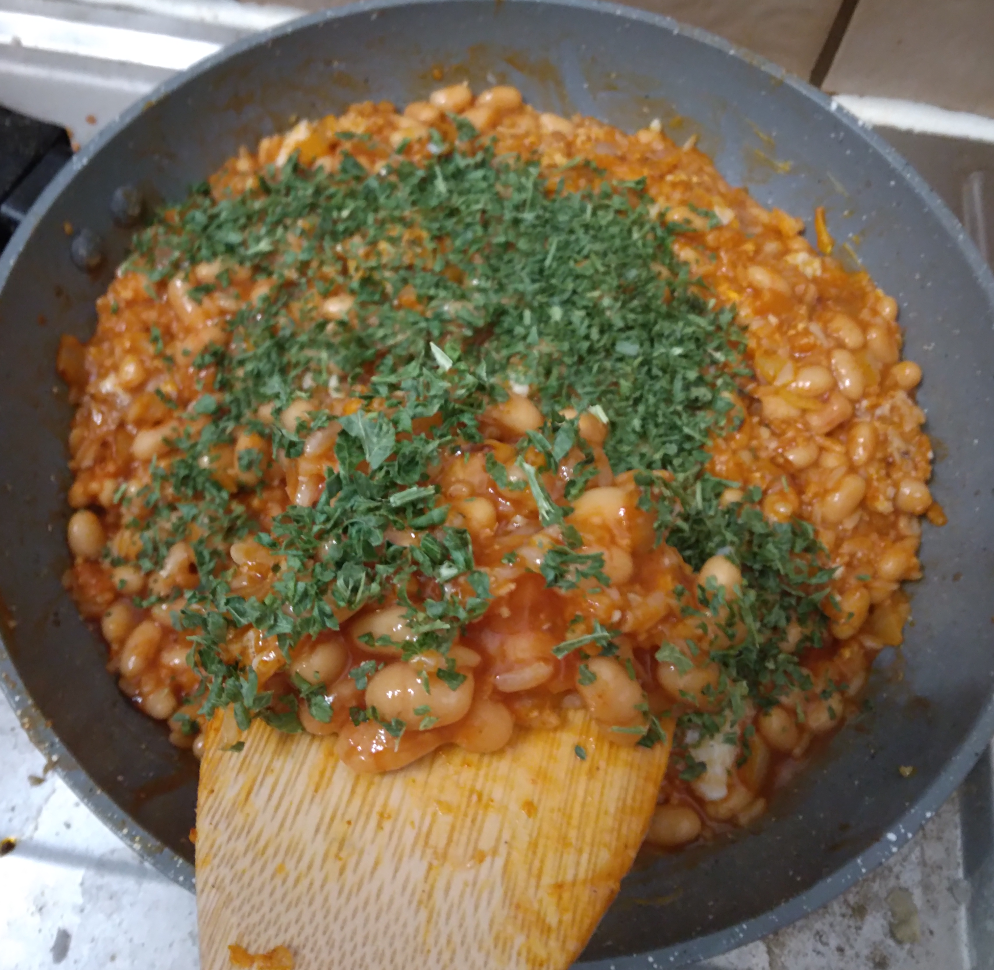 Boiled som mung beans and put to the side. Fried up a large onion, some carrot, parsnip, garlic. Added some freshly ground mustard seeds, cayenne, tomato paste. Let fry a bit extra. Then a box of chopped tomato, and water using the box to rinse out all the tomato stuck to the sides, some basil. Boiled until veggies are almost tender.