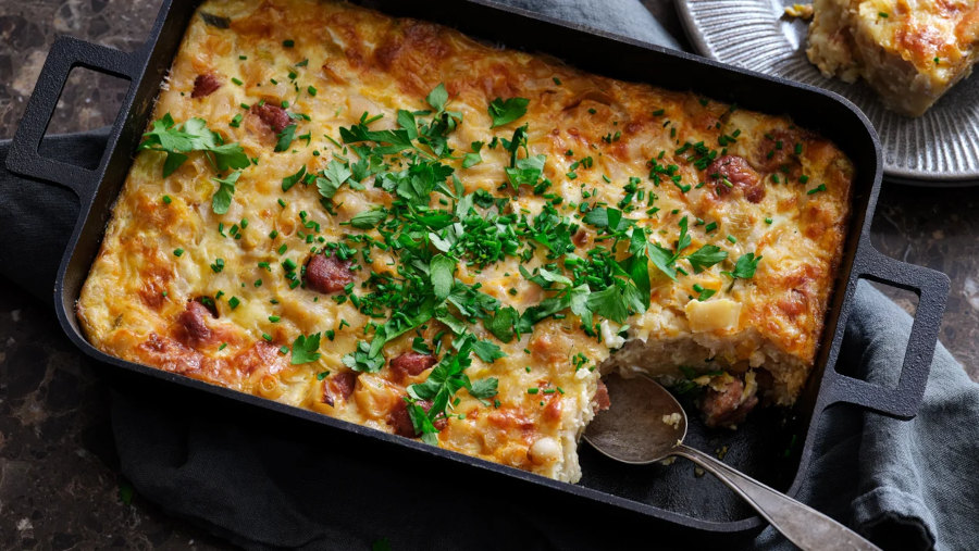 It's extra good if you have something spicy with lots of flavour for protein, like a chorizo cut into thin half circles and fried for some browning. Thyme is a good optional additional spice for the egg & milk mixture.