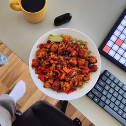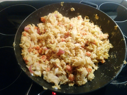 Heat up some leftover rice in the microwave. In a frying pan, heat up some oil and in it mix together equal parts peanut butter and gochujang (just a warning though, this actually smells terrible for some reason, it tastes good when done). Put the rice in and push it around with a spoon until everything is equally covered. Again, dunno what veggies would fit, improvise if you want any. Good with a fried egg.