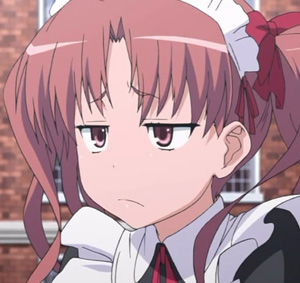Looking for a picture of a girl in an anime with pink hair and a rose in her mouth leaning on something and looking smug in a relatively flat style. I will post THREE nice images in return and mail you $100.