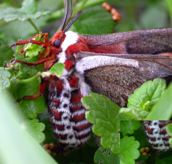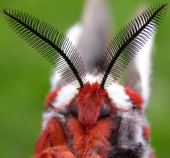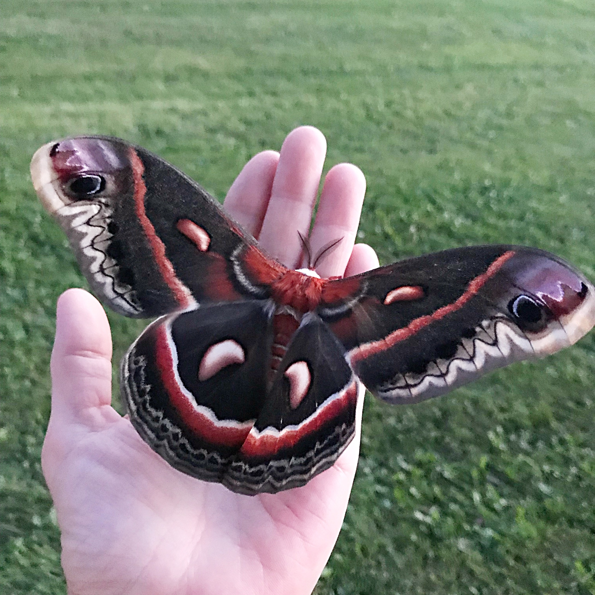 The final moth I'll mention here is Hyalophora cecropia (Cecropia Silk Moth). Not only are their wings colors and patterns beautiful with the orange white and black, but their bodies also have a really pretty reddish orange and white pattern on them! (images attached)