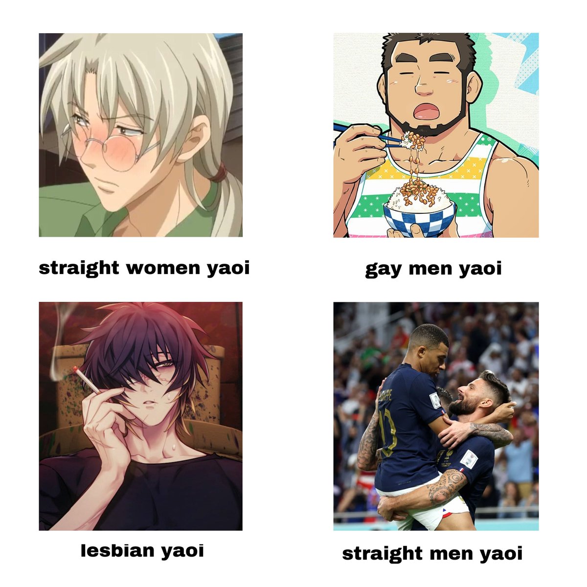 though if it isn't about the target audience and more about aesthetic to which some imaginary audience is attributed, then it kinda makes sense. tho again eh, gachimuchi is gay, i wouldn't want to call it "straight men yaoi", there is nothing straight about it. likewise, homoerotic subtext isn't enough to qualify as yaoi but even if we accept it, the heterosexual men wouldn't be the audience of that aesthetic, as opposed to the straight women in the opposite quadrant - i suppose it's a bit of a logic degradation overall, like, one could see what you are talking about but it shouldn't be presented like this at all then and no, i cannot get behind the wording of "lesbian" or "straight men" yaoi at all