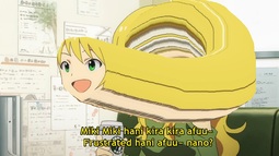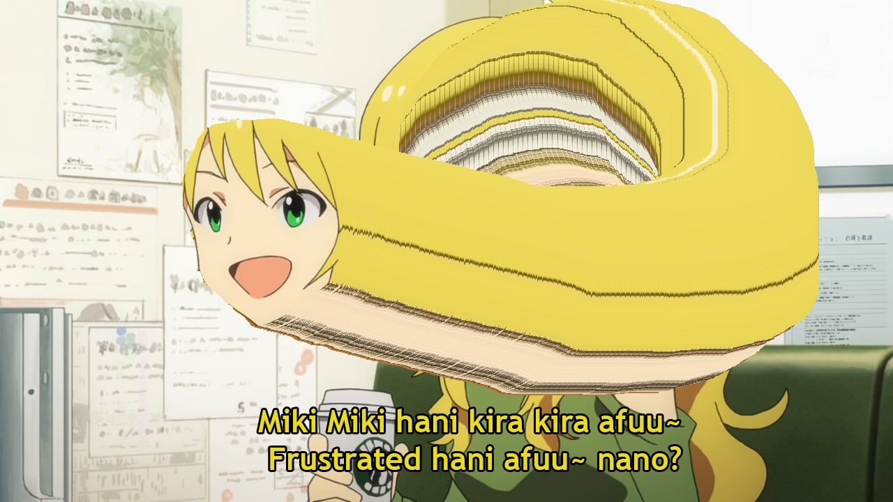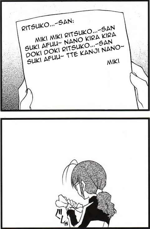 Miki-Miki nano Miki, suki Miki kira kira doki doki suki afuu nano. Nano suki afuutte kanji, kira kira, Miki-Miki no Miki teki ni wa doki dokitte kanji suki suki. Afuu Miki-Mikitte kanji no Miki teki ni wa afuu nano. Hani, doki doki suki afuu nano suki hani hanitte kanji?