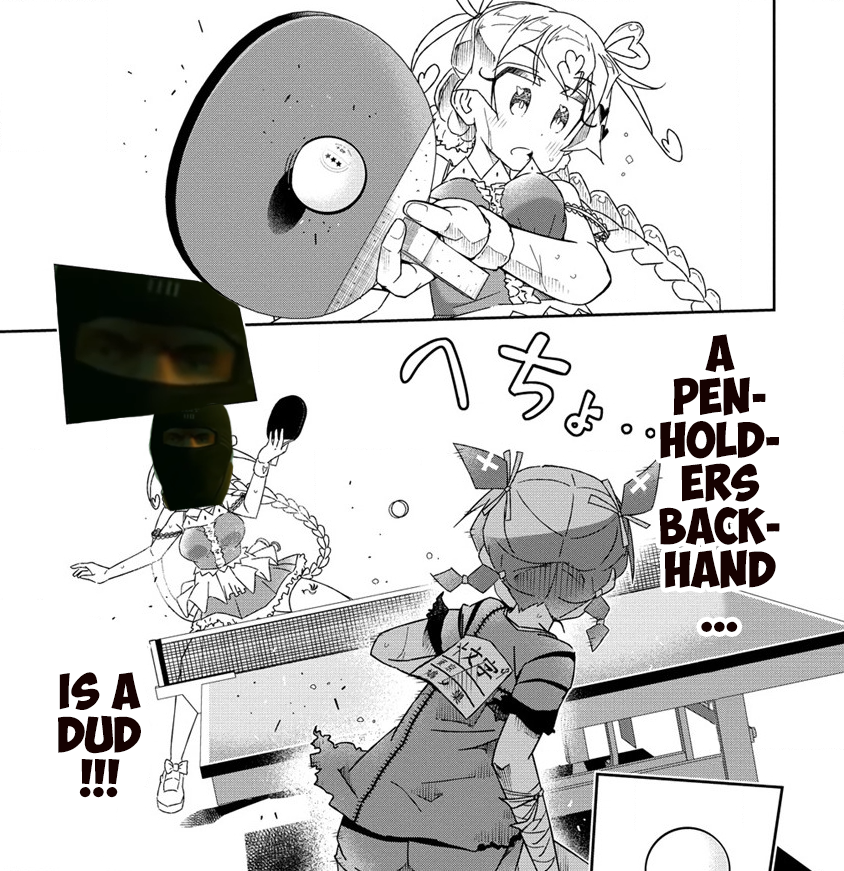 The reverse penholder backhand=I checked around a little more and nothing seems to indicate I translated this wrongly. It's defined as a way to mitigate the weaknesses of the penholder grip specifically for the same troubles Kuroba was going through in her match with Pitari.